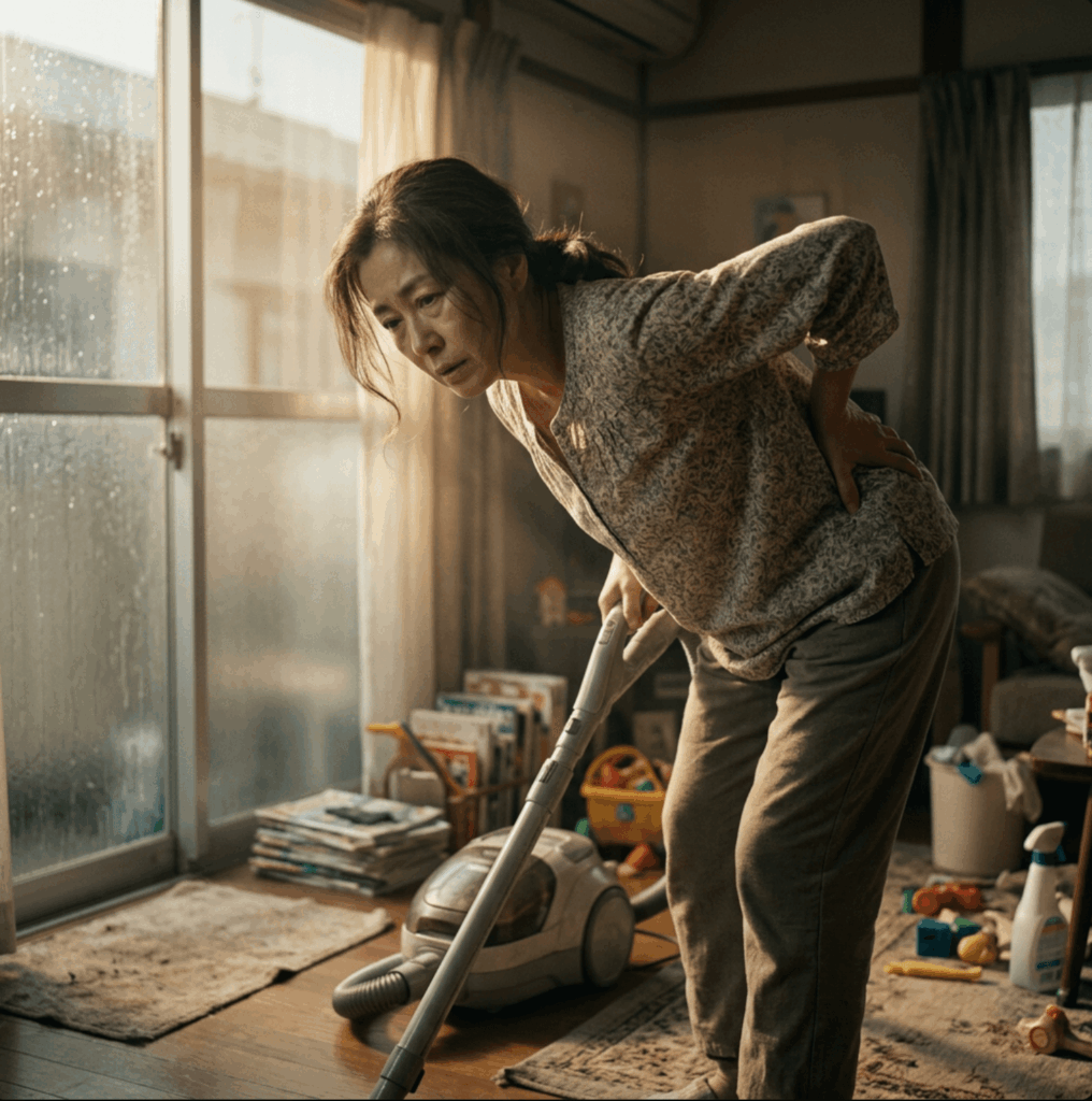 掃除機がけは、腰に負担がかかる要素が複数重なる動作です。
