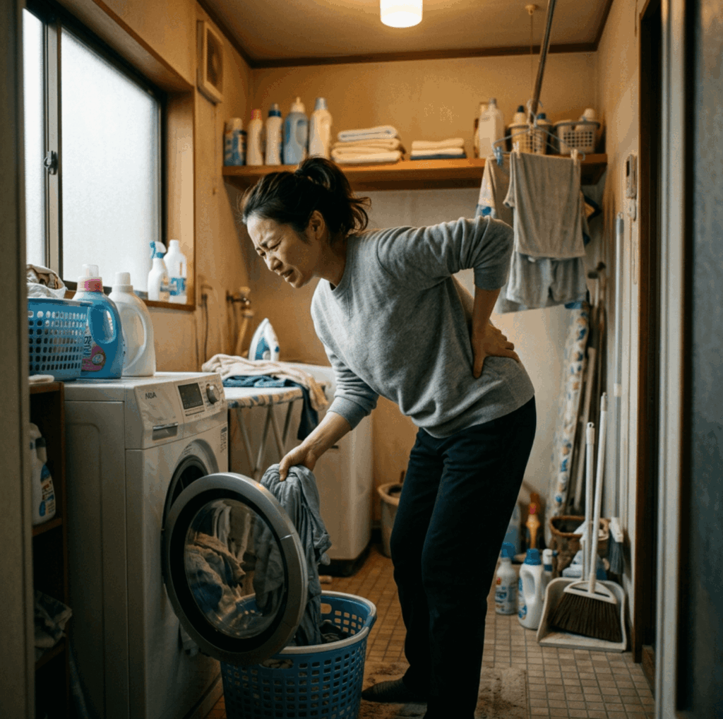 低い位置で力を入れてこする動作は、前かがみ+回旋+力の発揮が重なります。 家事動作の中でも、特に腰への負担が大きい作業の一つです。