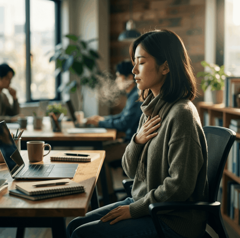 それだけ頻繁に繰り返しているのに、ほとんどの方は無意識のうちに「浅い呼吸」を続けています。現代のデスクワークやスマートフォン操作では、前かがみの姿勢が続きがちです。この姿勢が横隔膜(おうかくまく)の動きを制限し、呼吸を浅くしてしまうと考えられています。[2]